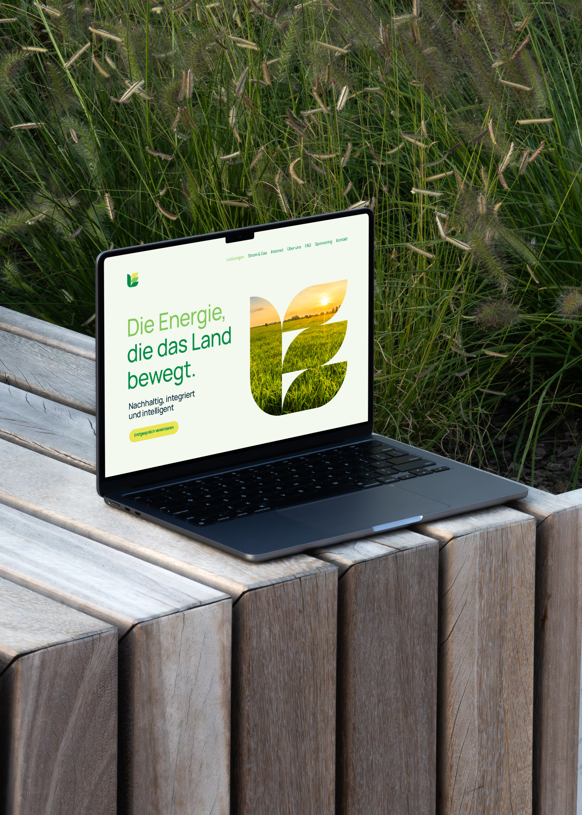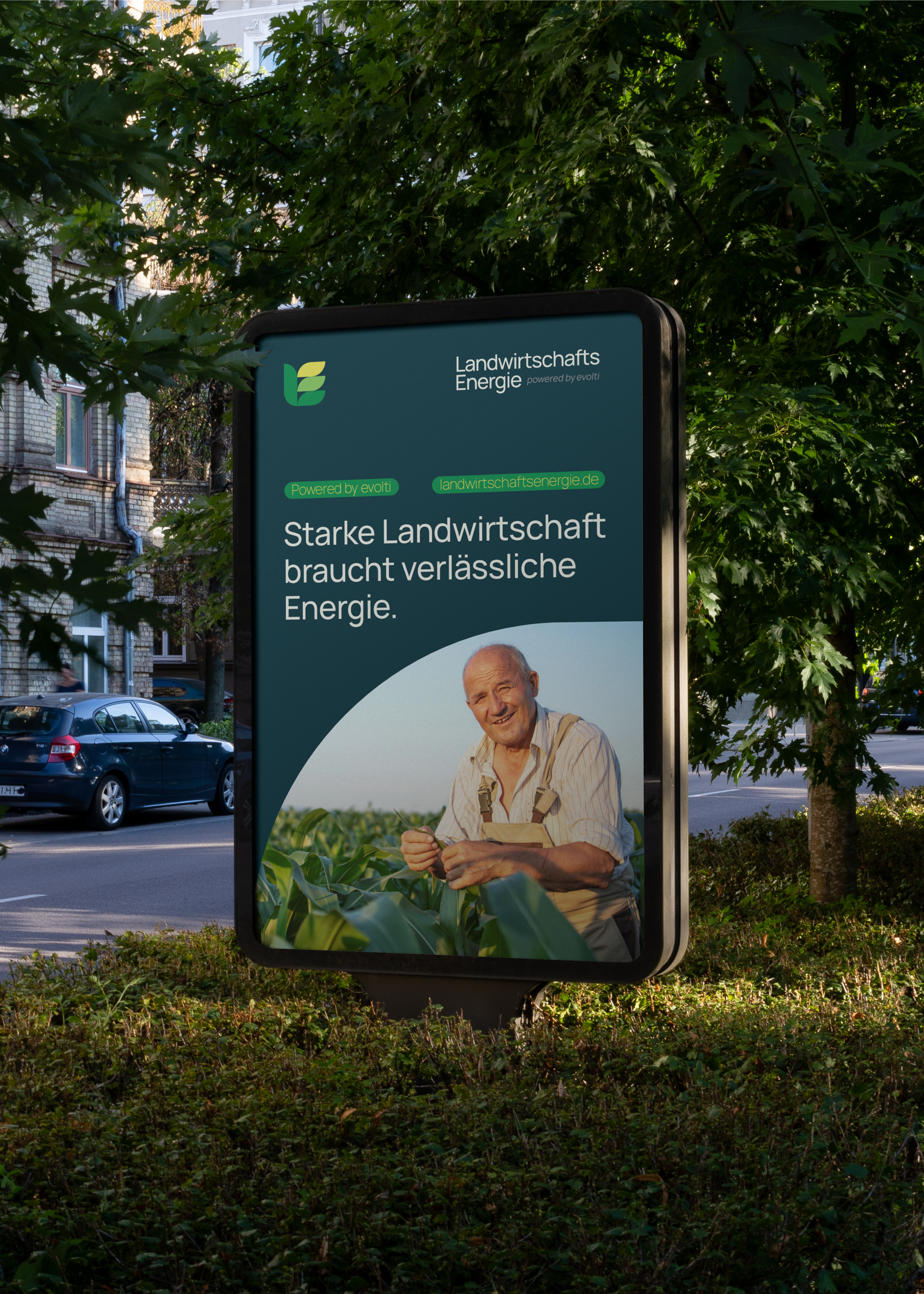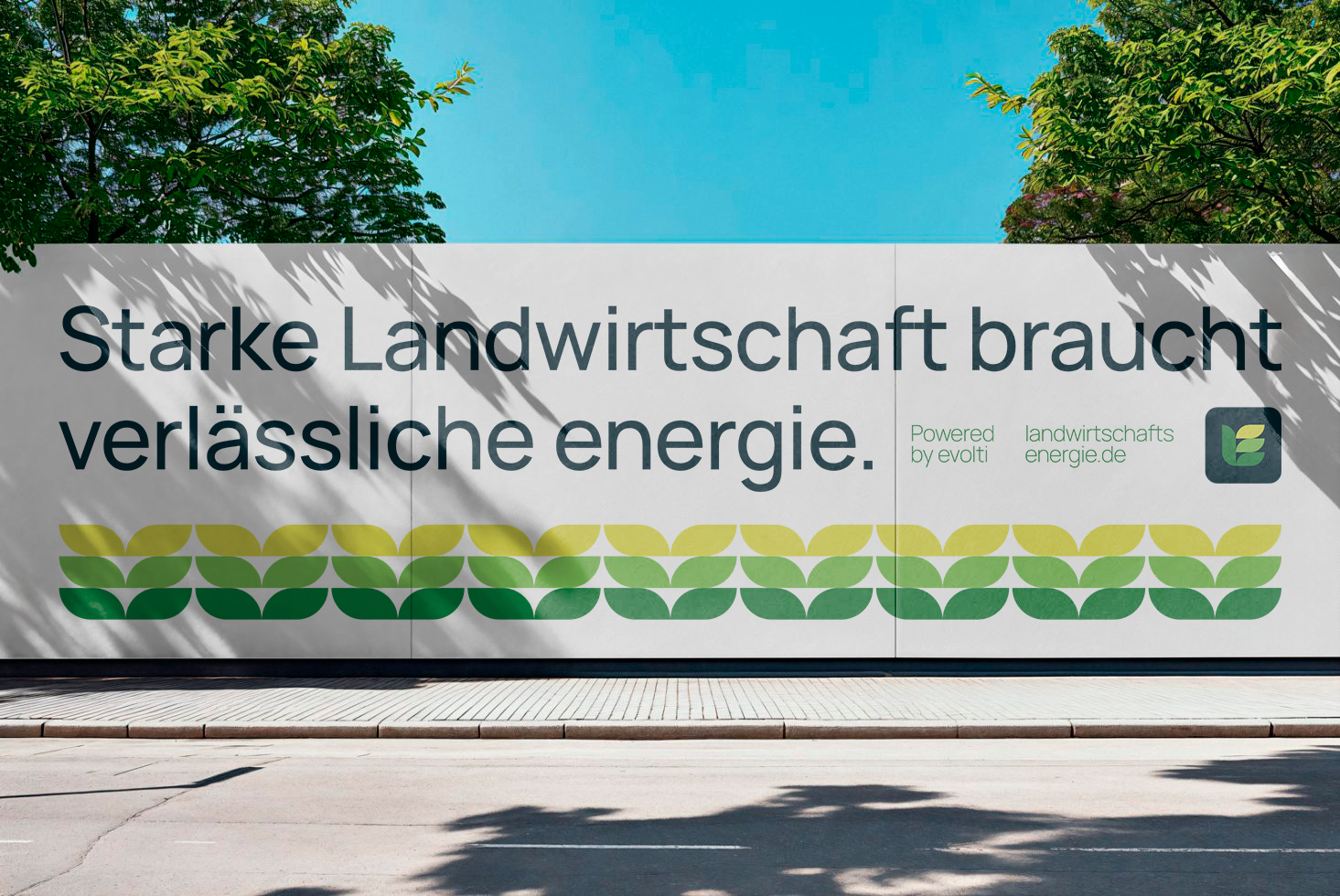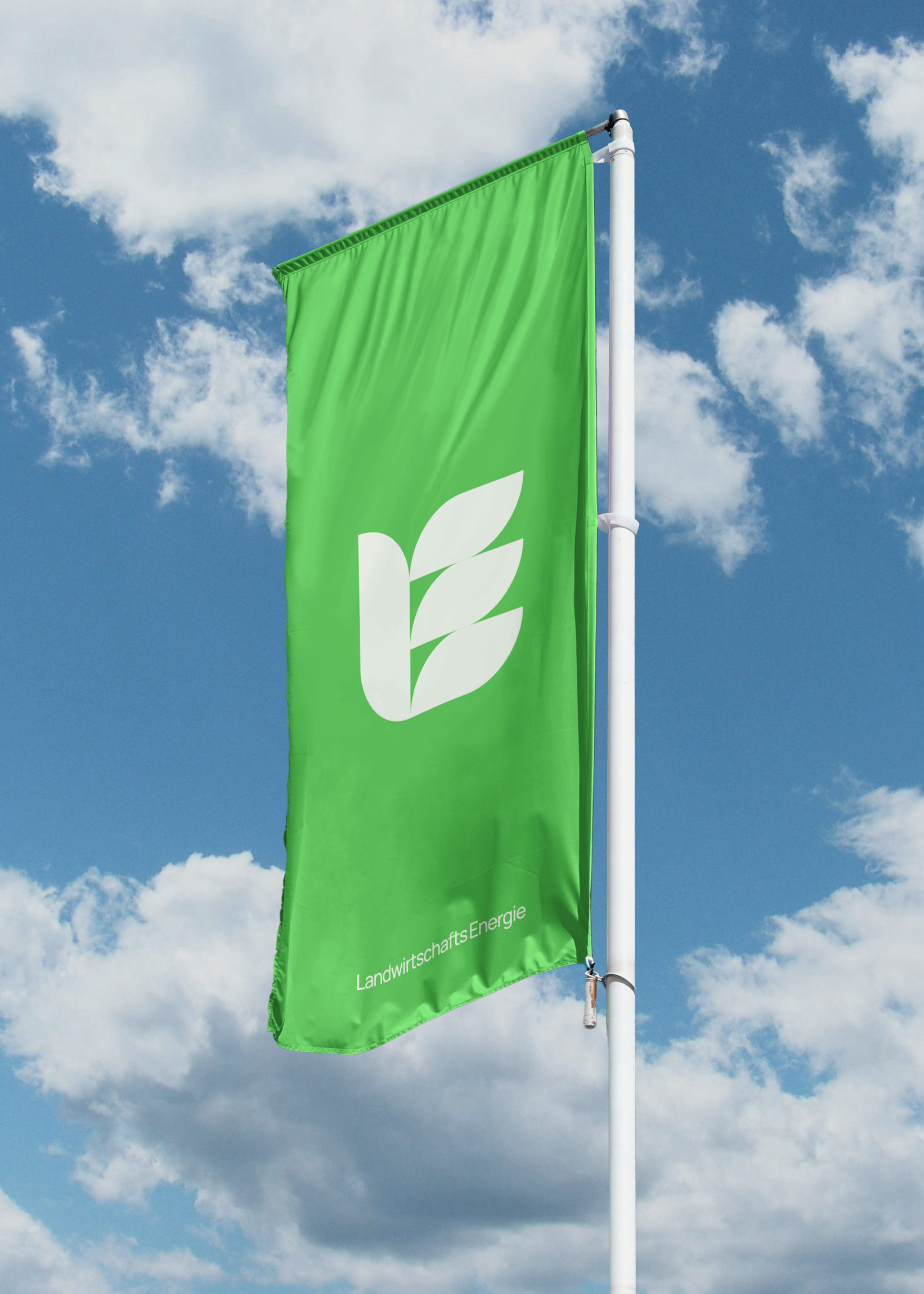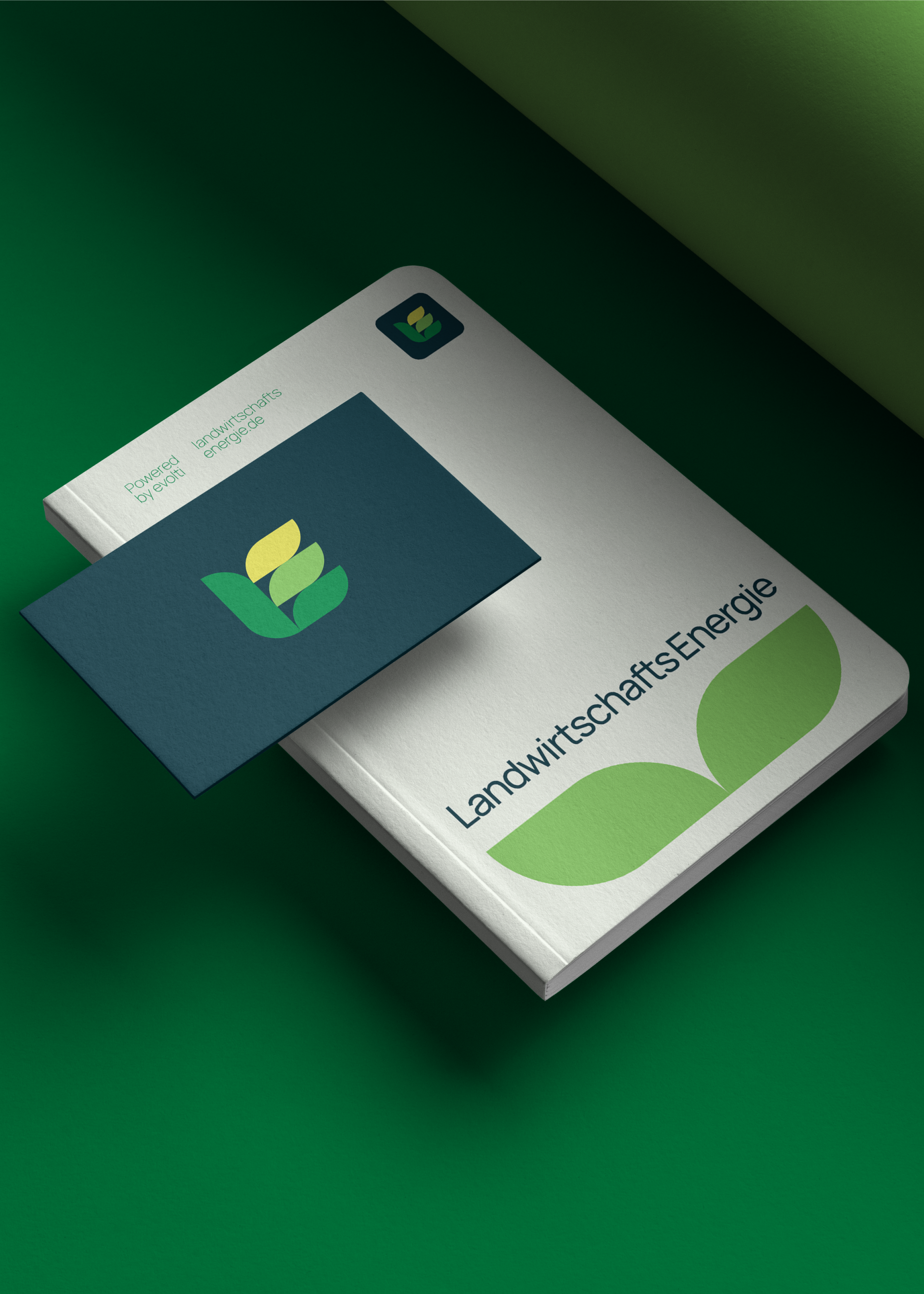 Das Logo verwendet ein Symbol, das an Blätter in verschiedenen Grüntönen und Gelb erinnert und damit klar die Verbindung zu Landwirtschaft, Natur und erneuerbarer Energie vermittelt.
